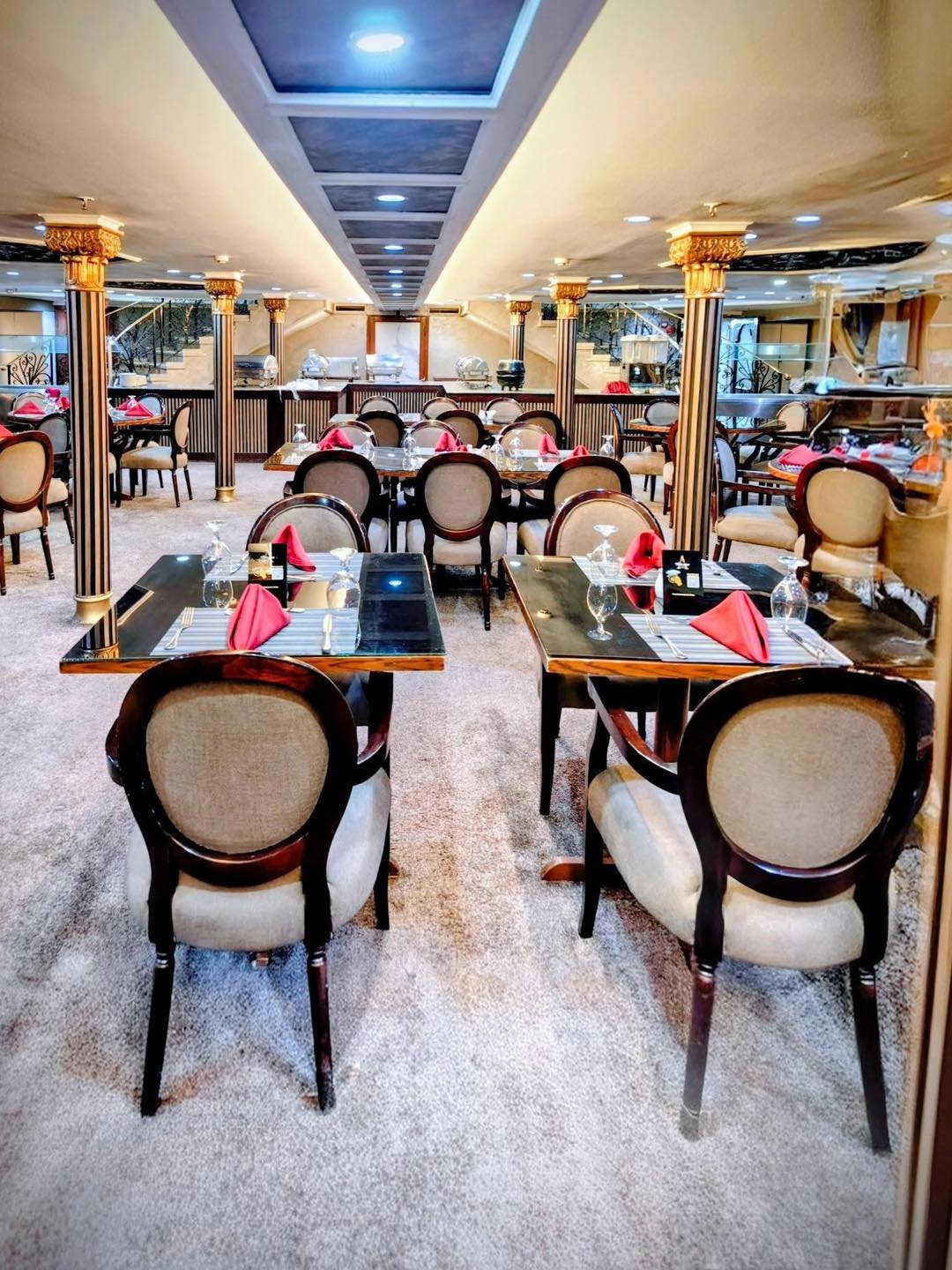 تشمل المرافق على متن المركب حمّام سباحة على السطح الشمسي الواسع، ولاونج وبار للاسترخاء في المساء، إلى جانب مطعم يقدّم خيارات طعام متنوعة أثناء الإبحار في نهر النيل.