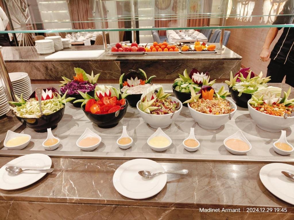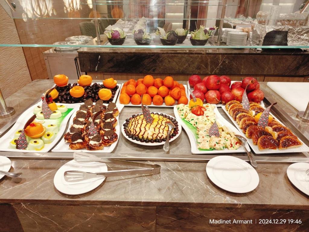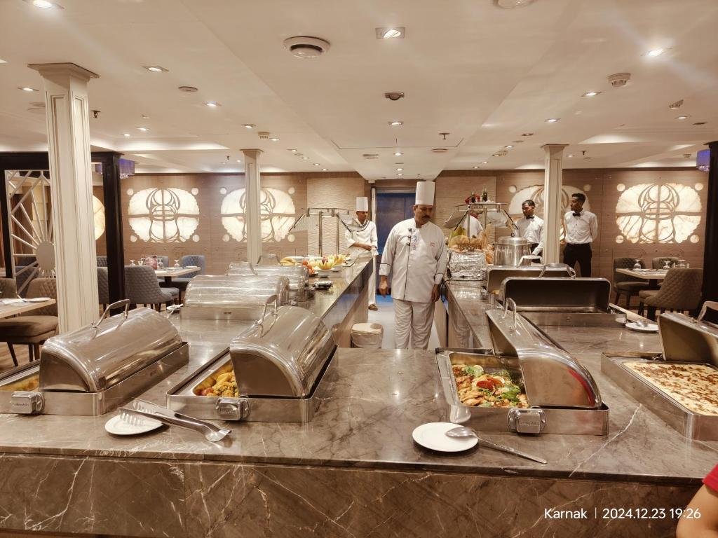 الإفطار، الغداء، العشاء، بوفيه مفتوح، وجبات خفيفة، وقت الشاي، وتقديم الكيك أثناء الإبحار.