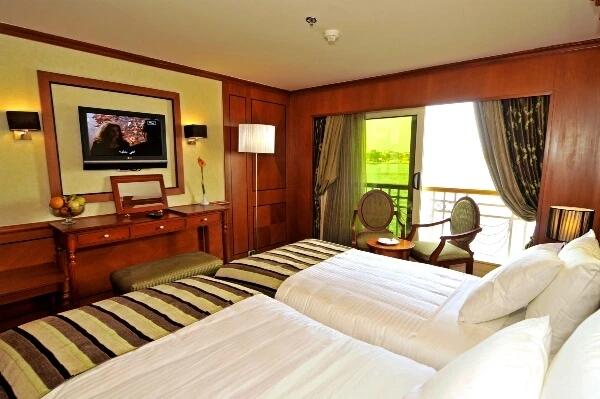 Royal Viking Nile Cruise Luxor & Aswan – Luxury Voyage offers a sophisticated 5-star Ultra deluxe sailing experience through the heart of ancient Egypt. The Royal Viking (also known as the MS Royal Viking) features 68 spacious deluxe cabins and 4 royal suites, each designed with elegant wooden panels and contemporary décor. Cabins are equipped with full-length French windows and balcony rails, providing panoramic views of the river. Modern comforts include individual climate control, a sitting area, an LCD satellite TV, and a private bathroom featuring a bathtub with teak flooring. For enhanced luxury, the royal suites offer up to 40 square meters of space and a private Jacuzzi overlooking the Nile.